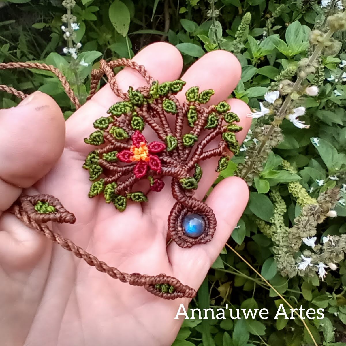 Colar em Macramê marrom e mostarda com Abelha e Flor